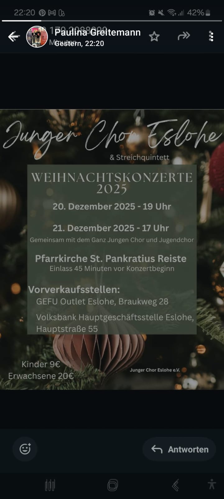 Die Weihnachtskonzerte finden am 20.12.2025 und 21.12.2025 in der Pfarrkiche St. Prankatius Reiste statt. Neben dem Jungen Chor treten der Ganz Junge Chor und der Jugendchor auf.