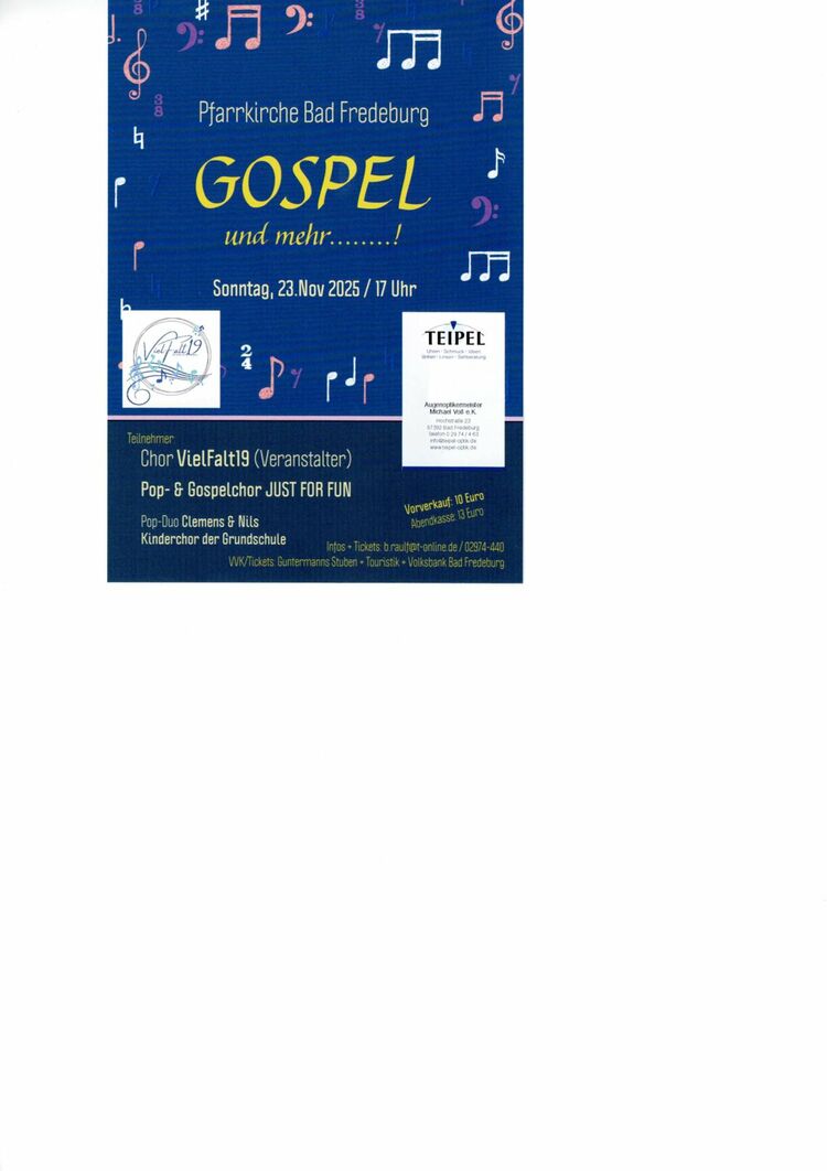 In diesem Jahr findet das Konzert „Gospel- und mehr“ in der St.-Georg-Kirche in Bad Fredeburg statt. Am Sonntag, 23.11.2025 wird der Chor um 17.00 Uhr die Zuhörer mit alten, bekannten Liedern und neuen Gospel erfreuen. Zum ersten mal wird der Schulchor der Grundschule Bad Fredeburg unter der Leitung von Niels Albers teilnehmen sowie der Meisterchor „Just for Fun“ . Das Duo Clemens und Nils wird mit seiner eigenen Stilrichtung begeistern. Die Sängerinnen und Sänger freuen sich auf das Konzert und einen stimmungsvollen Nachmittag.